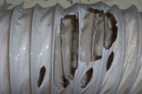I discovered this hole in the dryer transition tube last night and, at first, it puzzled me. Then my wife said that it looked like something chewed through it. She was right. It turns out that the lint buildup around the exterior vent flap was enough to keep the flap open. That, of course, is an open invitation. I set a mouse trap in the laundry room and got one about two hours later. The next trap still hasn't caught anything. Anyway, first thing I did this morning was clean the lint out and now the flap flaps like it should. Then I measured the height of the flap opening to the ground - 21.5 inches! A mouse (or mice) scaled (or jumped) 21.5 inches up and into the tube and then chewed through the tube! Wow. I put a new tube on and I know now that I need to check the flap and the tube from time to time.